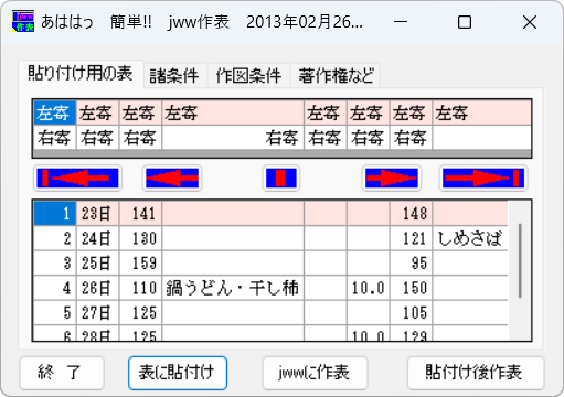 | あははっ 簡単!! jww作表 ここをクリックして下さい (Vectorのページへ飛びます) ![]() | データをエクセル上で選択コピーし、jwwの外部変形(外変)を利用し貼り付け。 こんな簡単な操作で、jww上で作表が可能です。 もちろん基本的な下記操作も行えます。 (1).文字サイズの変更 (2).上下左右のマージン寸法の変更 (3).左揃え、右揃え、中央揃えなどの配置形式の変更初心者の方にも 理解できそうな簡単な取扱い説明も、PDF形式で付けています。 jww初心者の皆様、楽に仕事をしたい皆様、御利用下さい。 ダウンロード数 3,629回 (2025_1202 現在) |